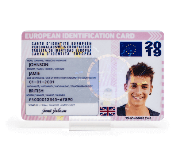 As with all our cards, the EU ID card features hologram overlay as standard. Enhance it further with a uniquely designed UltraViolet security layer which is only visible under UltraViolet light.